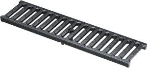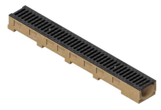 Canais de drenagem em betão polímero com grelha S100. Largura interior 100 mm e diferentes alturas. Peças com 1000 mm de comprimento. Com encaixe macho-fêmea para união e pré-marcas para abertura das saídas